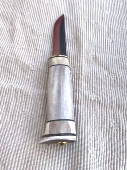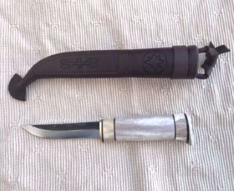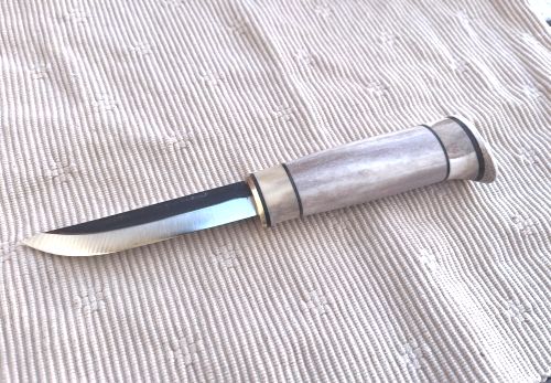 A knife with a reindeer horn handle, an 9 cm long carbon steel blade and leather sheath .