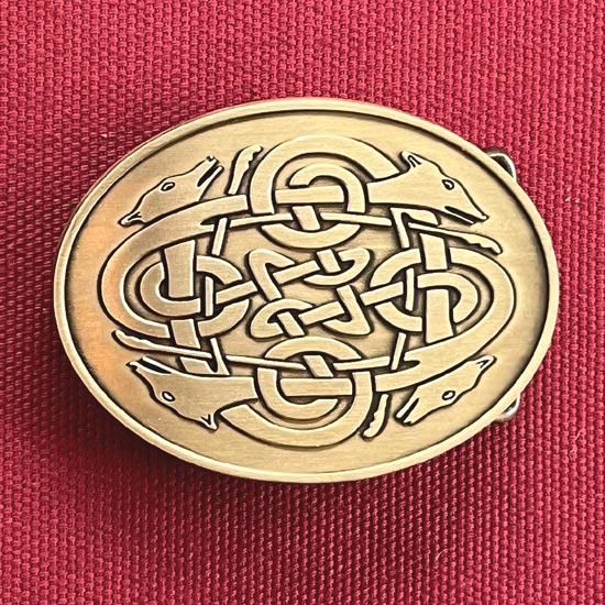 Ett stilrent ovalt bältesspänne med slingrande vargmotiv av keltisk ursprung.