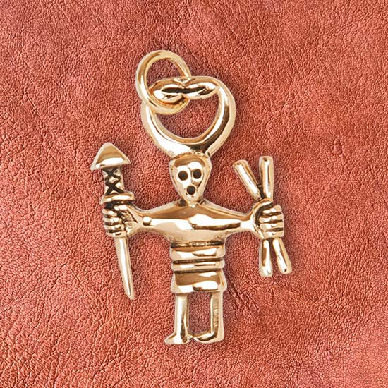 Ett hängsmycke av brons föreställande en vapendansare som tillhör odenkulten. Efter ett originalsmycke från vikingatiden.