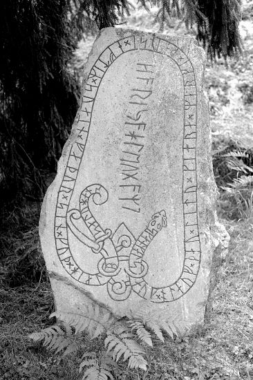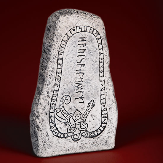 En minikopia av runstenen som står vid Skåäng nära Vagnhärad i Södermanland.