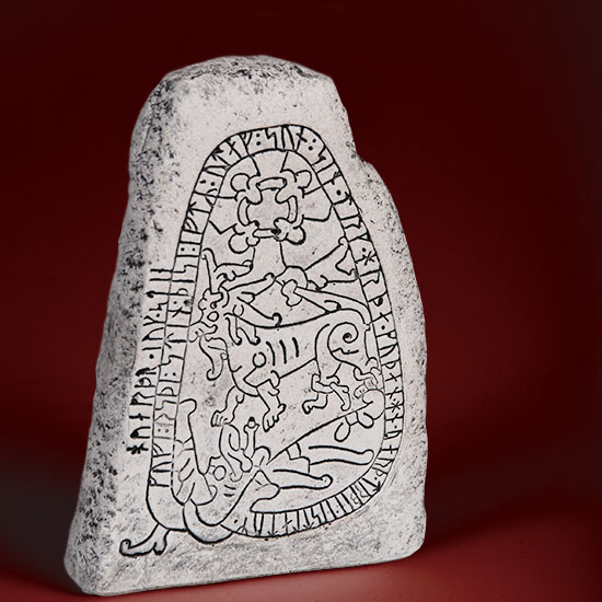 En minikopia av runstenen som står vid Norra Åsarp i Västergötland.
