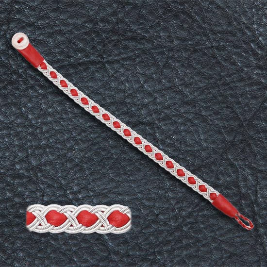 Armband av rött renskinn med tenntrådsbroderier och knapp av renhorn.