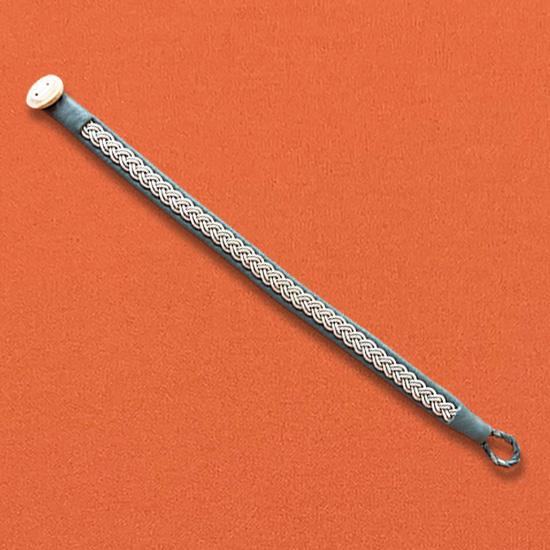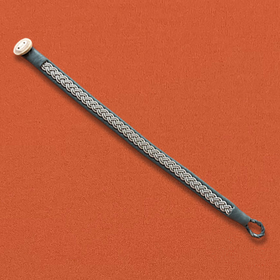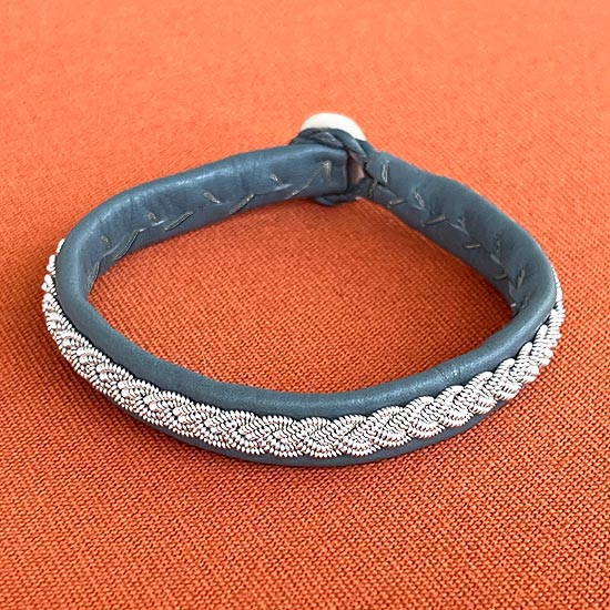 Armband av gråblå renskinn med tenntrådsbroderier och knapp av renhorn.