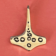 En torshammare. Torshammaren som härstammar från vikingatiden är ett omtyckt amulett som ger lycka och skydd.